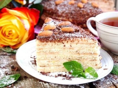 11. хорошо промазать по бокам. 12. Далее украсить тортик тертым шоколад и миндалем. Шоколад можно заменить кокосовой стружкой, тогда получится беленький тортик. Затем тортик убрать в холодильник часа на 2, чтобы пропитался. Я на ночь оставляла. Приятного аппетита!