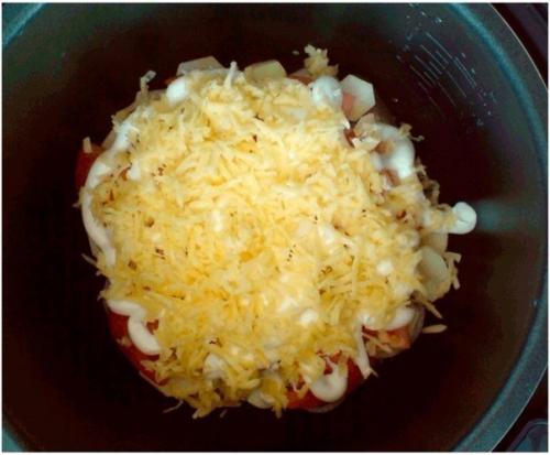 Нарезаем мясо мелкими кусочками, минут 10 даем просушиться, затем его солим и мы добавляем приправу. Нарезаем картофель кружками. Выкладываем мясо в мультиварку (предварительно смазав чашу растительным маслом. Добавляем лук, нарезанный кольцами. Выкладываем сверху картошку. Режем кольцами помидор и добавляем в чашу. Добавляем майонез