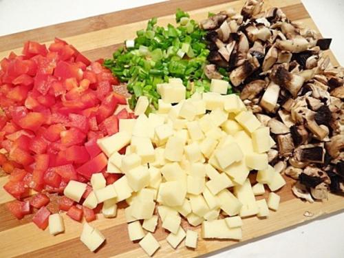 3. нарезаю кубиками сладкий перец, моцареллу, шампиньоны.