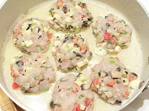 7. выкладываю на разогретую сковороду с растительным маслом котлеты (котлеты я формую смоченными в воде руками), обжариваю котлеты на среднем огне под крышкой с двух сторон.