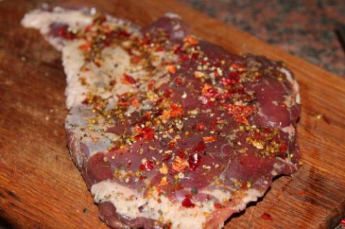 Натираем смесью с обеих сторон панчетту, присыпаем размятым перцем: