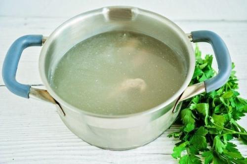 Бульон из говядины или свинины сварить. Лавровый лист и черный перец добавить.