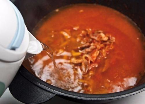Опять-таки: не дайте обжарке подгореть, огонь убавьте, помешивайте постоянно. Дайте лишней жидкости выпариться, но не более. Теперь можете положить соленые огурцы, грибы и оставшуюся часть нарезанной говядины. Тут же залейте содержимое сковороды стаканом огуречного рассола. Когда рассол закипит, влейте в сковороду воду. Количество воды уже зависит от габаритов сковороды. В мою, похожую на вок, помещается литра полтора. Когда солянка закипит, добавьте в нее оставшиеся копчености.