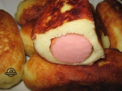 4. в каждую лепёшку положить по сосиске, и обернуть ее тестом.