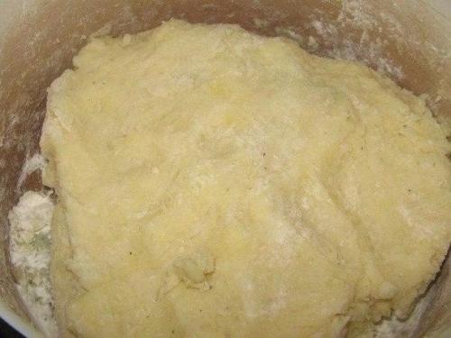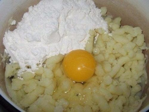1. горячий картофель размять, добавить яйцо, соль, муку и замесить тесто не липнущее к рукам.
