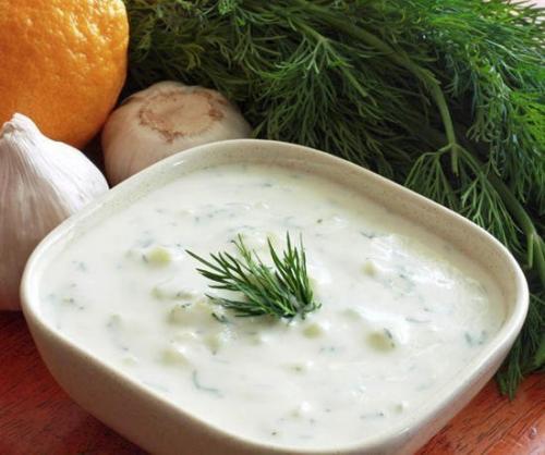 Смешайте тертый огурец, измельченный чеснок и укроп. Добавьте йогурт, оливковое масло и лимонный сок, тщательно перемешайте. Приправьте солью и молотым перцем.