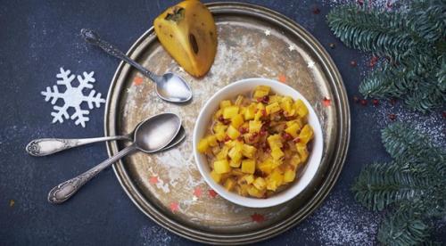 Очистите хурму от кожицы и семян, нарежьте мякоть кубиками со стороной 1 см.