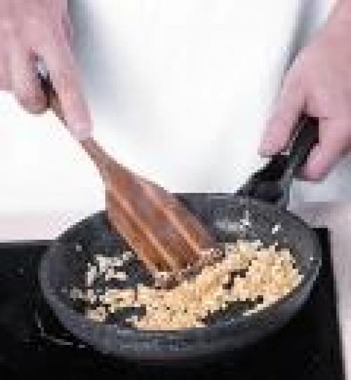 В сковороде нагрейте масло и обжарьте в нем лук на среднем огне до мягкости, 5 мин. Добавьте чеснок и жарьте, помешивая, еще 1 мин. Снимите с огня и остудите.