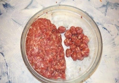 4. фарш хорошо перемешать и отбить о дно миски. Смоченными холодной водой руками скатать шарики размером с вишню. Для удобства поставьте рядом миску с водой.