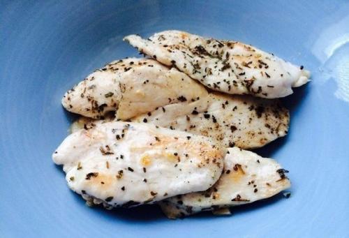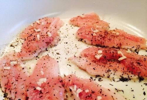 2. пока вода для спагетти закипает, приготовим курицу и соус. Филе курицы режем на пластины шириной 0, 5 см. На сковороду наливаем немного оливкового масла и ставим на средний огонь. Выкладываем Филе в один слой на горячую сковороду. Обжариваем две минуты. За это время чистим и очень мелко режем большую дольку чеснока. Посыпаем курицу половиной чеснока, солью, черным молотым перцем и 1/2 ч. л. базилика.
