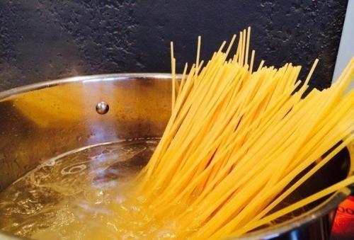1. мы ставим на огонь воду для спагетти. Как вода начнет закипать, вливаем две столовые ложки оливкового масла и соль, размешиваем. Спагетти отвариваем до состояния "аль Денте".