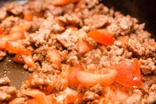3. помидоры нарезать на кусочки средних размеров, добавить на сковороду к фаршу. Перемешать.