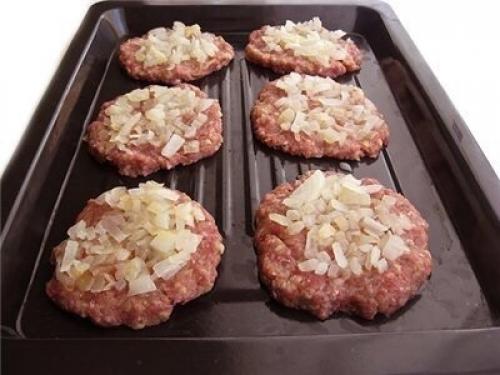 Сделать из фарша небольшие круглые лепешки ( диаметр 10 см. Выложить на противень, смазанный растительным маслом или застеленный пекарской бумагой.