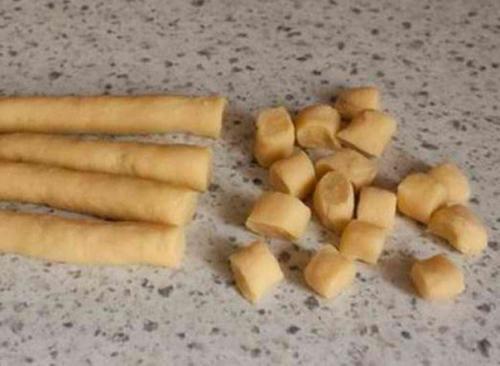 3. делим тесто на части. Из каждой формируем жгут толщиной около 1, 5 см. Жгуты на кусочки нарезаем. В глубокой кастрюле или сковороде разогреваем на среднем огне растительное масло до температуры 170 градусов.