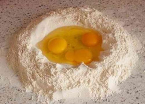 1. муку смешиваем с цедрой, солью и сахаром, мы высыпаем на рабочую поверхность Горкой. Делаем в центре углубление и вбиваем в него яйца.