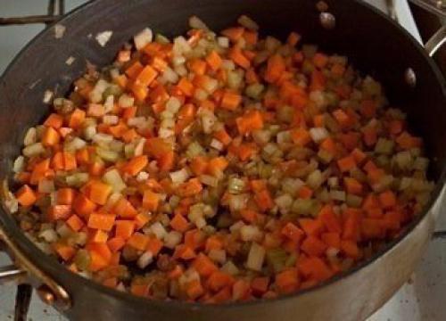 Уменьшаем огонь до среднего. Кладем в сотейник лук, морковь и сельдерей. Жарим, помешивая, около 5 минут.