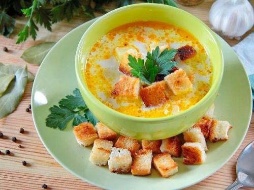 9. суп с курицей, рисом и плавленым сыром готов. Мы подаем его в горячем виде, украсив каждую тарелку хрустящими гренками и свежей зеленью. Приятного аппетита!