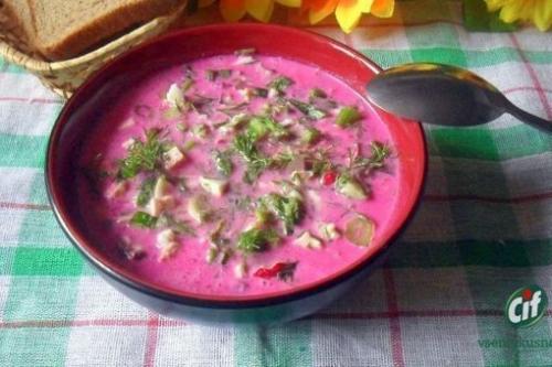 3. в тарелку кладем основу, добавляем кефирно - свекольную заливку, мы перемешиваем. Приятного аппетита!