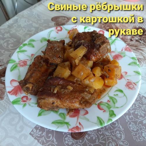 Берём рукав для запекания и выкладываем картофель первым слоем, далее сверху выкладываем второй слой рёбрышек и завязываем пакет.