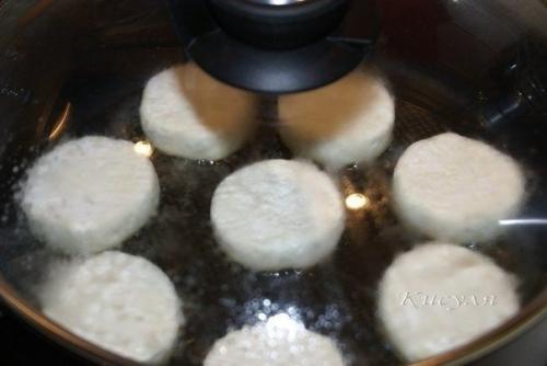 В сковороду добавить достаточно масла, сильно нагреть, выложить сырники, накрыть крышкой, убавить огонь (3, 5 из 9-и) для электро.