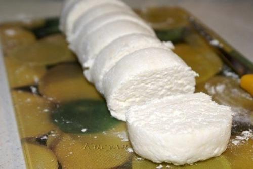 Чтобы сырники были одинакового размера, я скатала толстую колбаску из творога и разрезала её на шайбы.