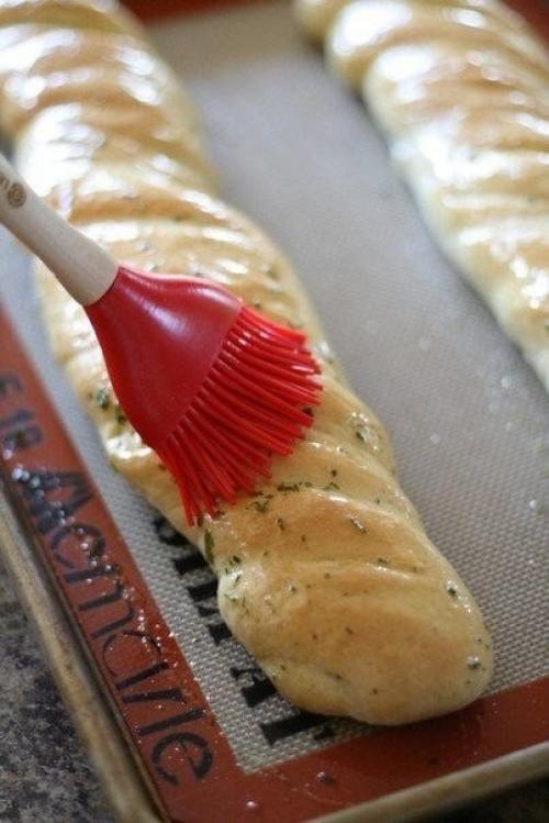 5. достаньте противень из духовки, смажьте багеты растопленным чесночным маслом и верните еще на 5-7 минут пока хлеб не начнет коричневеть и золотиться.