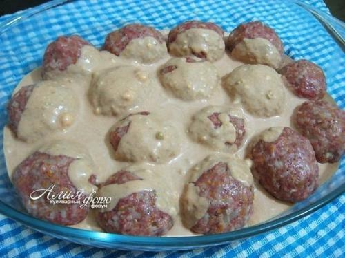Перемешать фарш с рисом, луком и морковкой. Также добавить специи и ложку майонеза. Сформировать тефтельки и сложить в противень.