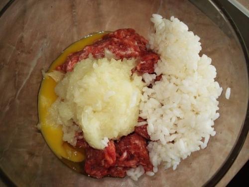 4. смешать фарш, яйцо, лук, рис. Хорошо перемешать.