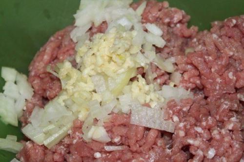 В фарш нарезать мелко лук, добавить выдавленный чеснок, 1 яйцо, посолить, поперчить. Хорошо вымесить фарш. Морковь натереть на крупной терке, лук мелко нарезать. Соломкой перец нарезать. На растительном масле пассировать овощи 5 минут.