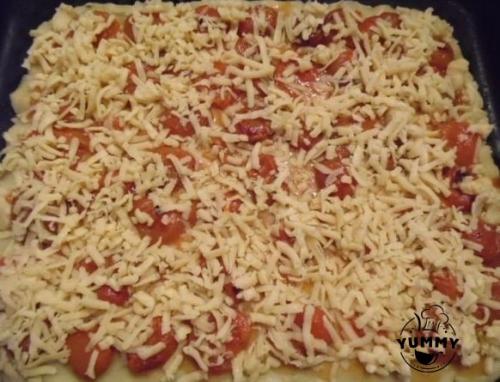 5. возьмем противень, на котором и будем сразу раскатывать пирог. Большую часть пирога руками растягиваем по периметру противня. Скалкой это делать не удобно.
