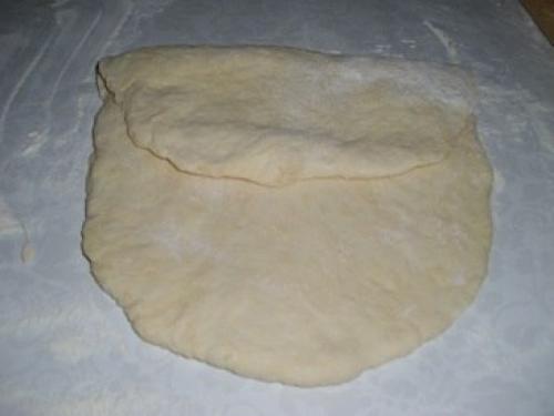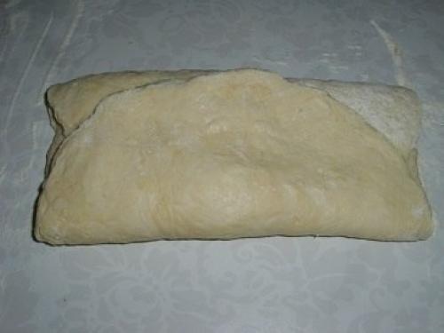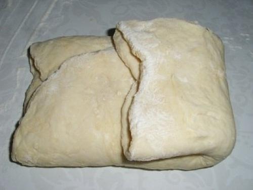 Тесто складываем в три слоя. Сначала складываем 1/3 часть с одного края, затем с другого. Затем еще раз в три слоя.