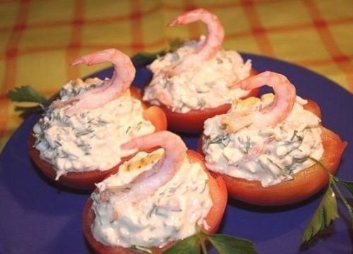 Ингредиенты: помидоры, креветки, мягкий сыр, укроп, сметана или майонез, горчица, соевый соус.