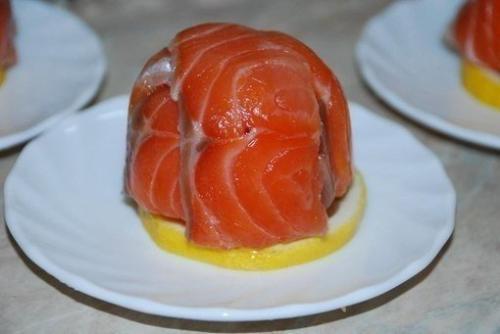 На каждый кружок лимона аккуратно поставить перевернутую вверх дном чашку с рыбой закуской.
