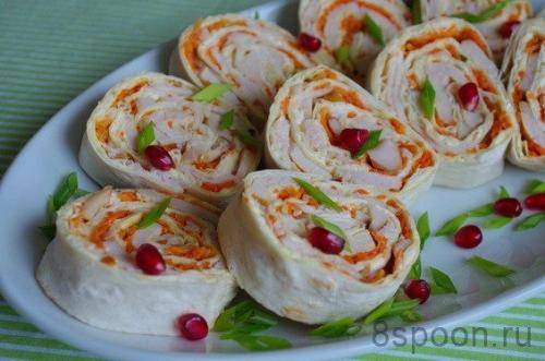 5. рулетик из лаваша с сыром и морковью и чесноком.