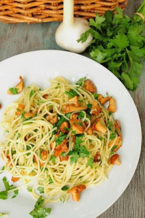 Прежде всего, нужно отварить спагетти. Следом - порезать грудинку полосочками. Лисички отварить в подсоленной воде в течение 10 минут, затем обжарить на оливковом масле до подсушенного состояния. Добавить к ним грудинку, обжарить еще пять минут. В них сливки влить. Перемешать и уменьшить огонь. Дождаться загустения сливок. Смешать соус со спагетти, добавить рубленый базилик. Готовое блюдо присыпать пармезаном и подать к столу!