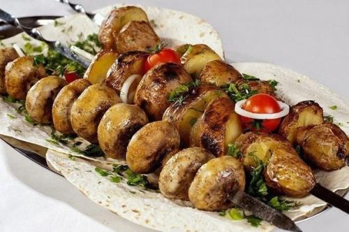 Шампиньоны промыть и выложить в большую миску. Добавить к шампиньонам херес, мелко нарубленный чеснок, оливковое масло, соль. Перемешать и промариновать полчаса. Промыть веточки розмарина и очистить их от листочков, оставив только кончики. Их мы будем использовать вместо шпажек для шашлыков. Надеть шампиньоны на веточку розмарина. На каждой веточке должно уместиться по 3 - 4 гриба. Шашлык из шампиньонов запекать на гриле по 2 - 3 минуты с каждой стороны. Готовые шашлыки взбрызнуть лимонным соком и оливковым маслом прежде, чем подать к столу. Приятного аппетита!