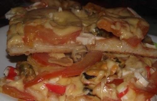 5. морская пицца: мидии, крабовые палочки, помидор, сыр. Томатный соус.