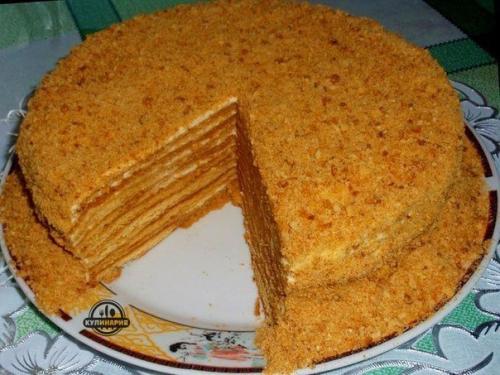 9. обрезанные края растолки в крошку. Края края торта немного смажь сметаной и облепи крошками. также сделать торт, посыпав его толчеными орехами. Теперь подожди еще 1 час и можешь подавать свой медовый вкусный торт к столу.