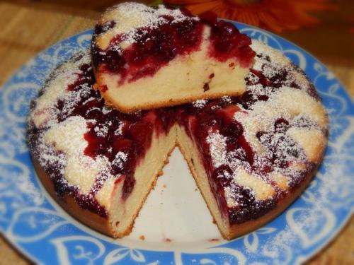 Муку и разрыхлитель добавить. Тесто довольно густое получается. Выложить в МВ. Сверху разложить вишню. Выпекать 60-90 минут, затем отключить и дать постоять минут 15, не открывая крышку. Открыть, немного остудить, выложить. Сверху посыпать сахарной пудрой (по желанию.