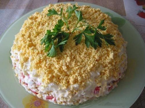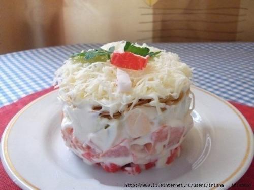 Салат слоями выкладывать. Все слои майонезом промазывать.