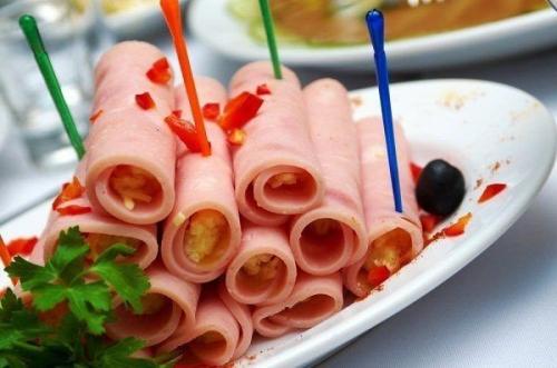 Кусочки ветчины намазать сырной смесью и свернуть рулетами. Получившиеся рулетики разноцветными шпажками закрепить.