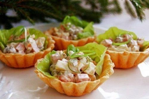 Все ингредиенты для салата нарезать кубиками и заправить майонезом. Наполнить корзиночки получившимся салатом и подавать.