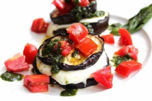 5. обжаренные диски баклажанов выложить на противень, застеленный бумагой для выпечки, смазать их пастой из базилика.