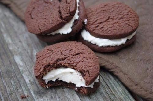 Как печенье будет готово, достаем его разрезаем на 2 части (если делали в формочках) и даем ему остыть. Делаем творожный слой - 10 г желатина заливаем 100 мл молока или воды и оставляем на 30 минут, что бы желатин набух. По истечении 30 минут, нагреваем желатин, размешиваем, но только не доводите до кипения, иначе он потеряет свои свойства. Готовый желатин смешиваем с творогом, так что бы творог не был совсем жидким (то есть может потребоваться не весь готовый желатин), но при этом не было комочков (можно взбить миксером или в блендере. Выкладываем на одну часть печенья творог, закрываем его второй частью печенья и убираем в холодильник минимум на 40 минут. Как творожный слой застынет, готовое печенье можно полить топленым горьким шоколадом (но не обязательно.