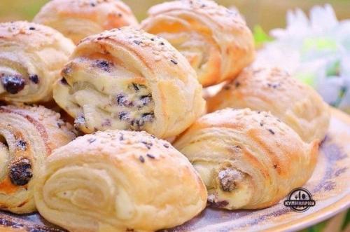 Смешать творог, 1 яйцо, сметану, ванилин и распаренный обсушенный изюм. Тесто разморозить, разрезать на 2 части. Раскатать в прямоугольник 15 на 35 см. Смазать половиной нормы начинки, не доходя до краев немного. Свернуть рулетом, край защипнуть, перевернуть швом вниз. Нарезать на кусочки 3-4 см шириной.