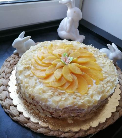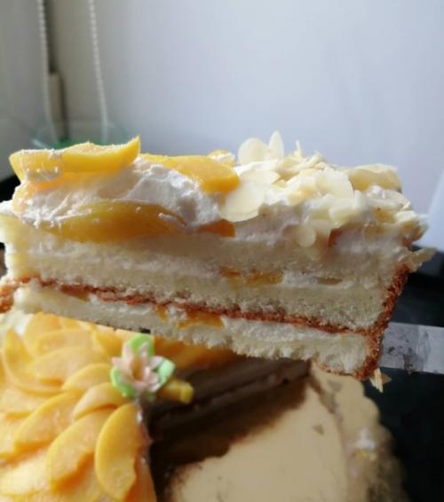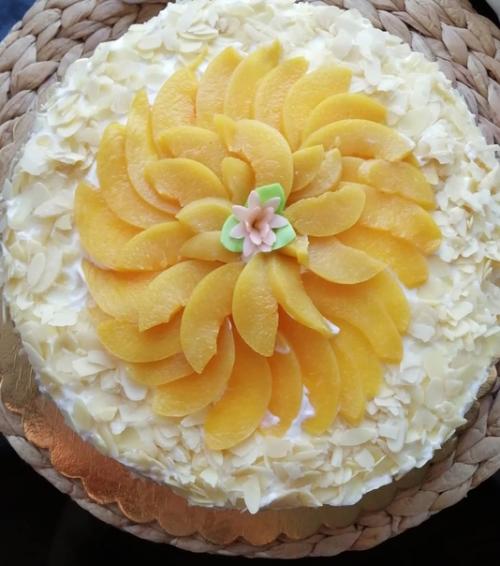 Бисквит нарезать на 3 коржа, каждый корж пропитываем сиропом из под персиков. Выкладываем - слой персиков, нарезанных кусочками, слой крема. Оставляем немного крема на выравнивание и украшение торта. Дать пропитатся не менее 10 часов приятного чаепития!