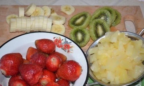 3. желатин залить холодной водой и дать набухнуть в течении получаса. Клубнику помыть, дать стечь воде. Киви, банан почистить и нарезать кружочками. Ананас достать из сиропа и дать ему полностью стечь.