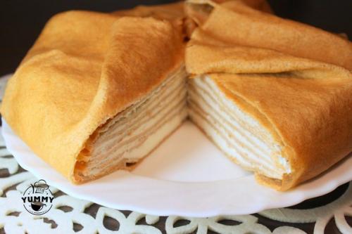 Смешать все ингредиенты на блины, добавить масло. Получается 7 шт. блинов, мы делаем начинку. Отварная грудка нарезанная мелко. Огурец кубиками, лук кубиками, чеснок мелко нарезать. Добавить зелень., 2 лож сметаны. Все перемешать. Собираем торт из 6 коржей 1 корж для украшения. Сверху 1 ст л сметаны на бока, равномерно размазать 7 й корж нарезать на тонкие полоски, и выложить в виде спирали. Приятного аппетита!