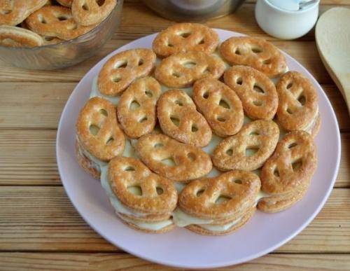 5. возьмите большое блюдо для тортика. Выкладывайте печенье максимально плотно друг к другу. Смажьте его щедро кремом.