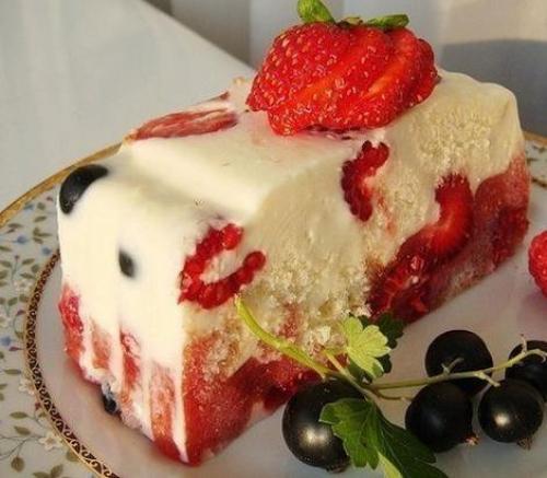 Глубокую миску застилаем пищевой пленкой и на дно выкладываем ягоды, далее слой поломанного на маленькие кусочки бисквита, опять слой ягод и т. д. все заливаем сметанно - желатиновой смесью. Ставим в холодильник на 2 часа. Торт аккуратно переворачиваем на блюдо. Внимание! Только в том случае, если миска очень глубокая, слои заливаем по мере укладывания. Также можно кислые ягоды сахарной пудрой присыпать.